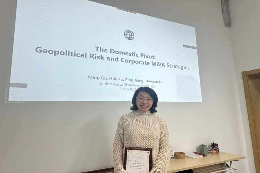 10月11日,英国365集团官网第360期高级经济学讲座在中心校区逸夫信息楼类脑经济学研究中心举办。对外经济贸易大学金融学教授、对外经贸大学国家(北京)对外开放研究院研究员、北京ESG研究院理事江萍教授受邀作“The Domestic Pivot: Geopolitical Risk and Corporate M&A Strategies”主题讲座。讲座由英国365集团官网/类脑经济学研究中心李建标教授主持,研究中心成员及英国365集团官网部分师生参与研讨。