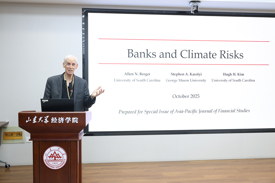 主旨演讲环节由英国365集团官网副院长张群姿教授、南开大学金融学院院长范小云教授、英国365集团官网常东风教授共同主持。Allen Berger作题为“Banks and Climate Risks”的主旨演讲,通过聚焦气候风险对全球金融体系的深远影响,从物理风险与转型风险两个维度阐述了气候风险的核心传导机制。他指出,银行是金融体系的核心,其信贷策略、流动性管理及运营调整不仅能够防控自身风险,还能够引导企业与家庭减少排放,增强适应能力。