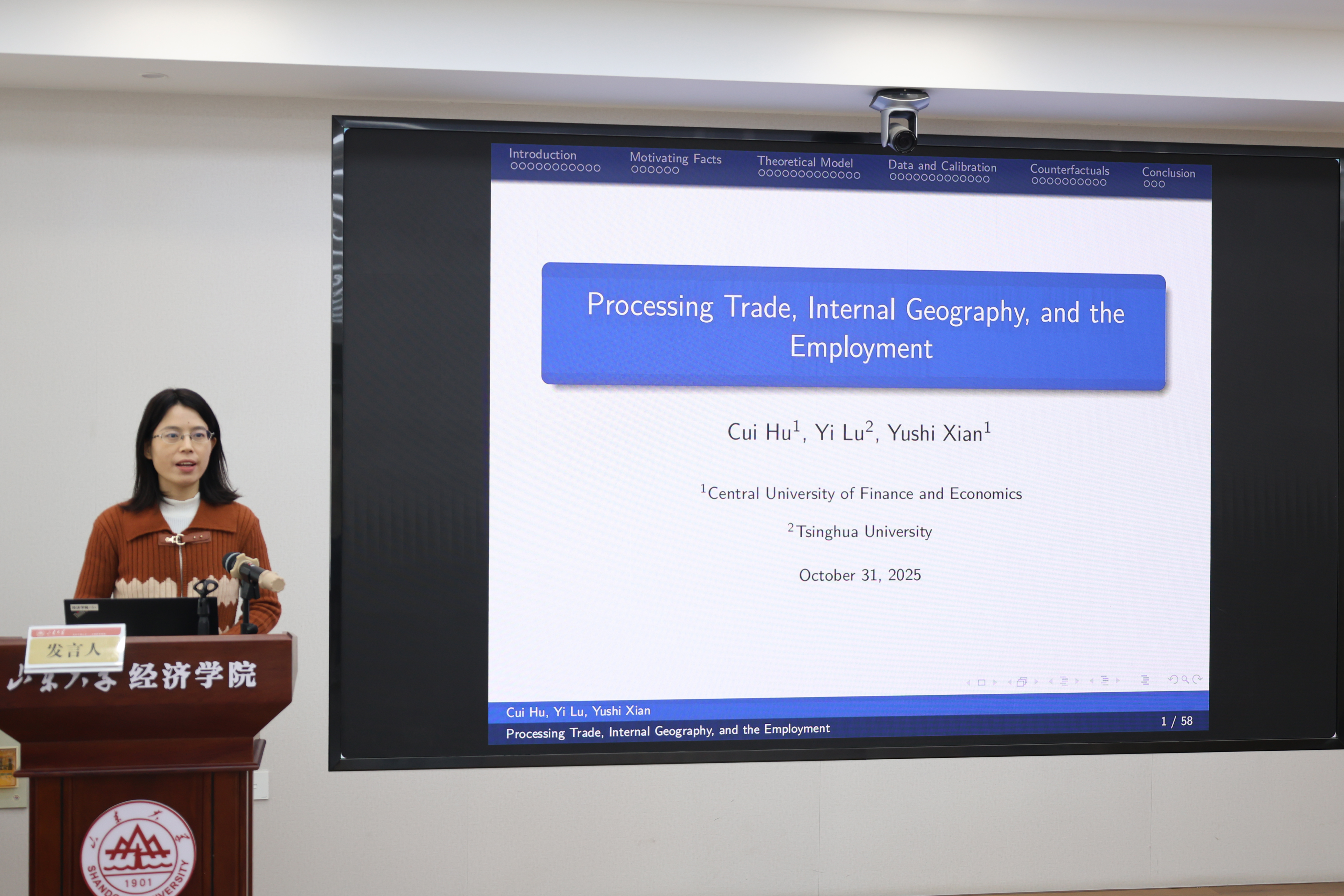 主旨报告第二单元由英国365集团官网綦建红教授主持。中央财经大学国际经济与贸易学院胡翠教授作题为“Processing Trade, Internal Geography, and the Employment”的报告,聚焦加工贸易“不完全贸易自由化”的属性,结合国内地理空间差异,阐述其对就业规模及地区就业分布的影响机制。她指出,加工贸易不仅对就业具有显著支撑作用,还能缩小地区间就业差距,而允许加工贸易产品内销和降低流动成本能够进一步优化就业市场表现。