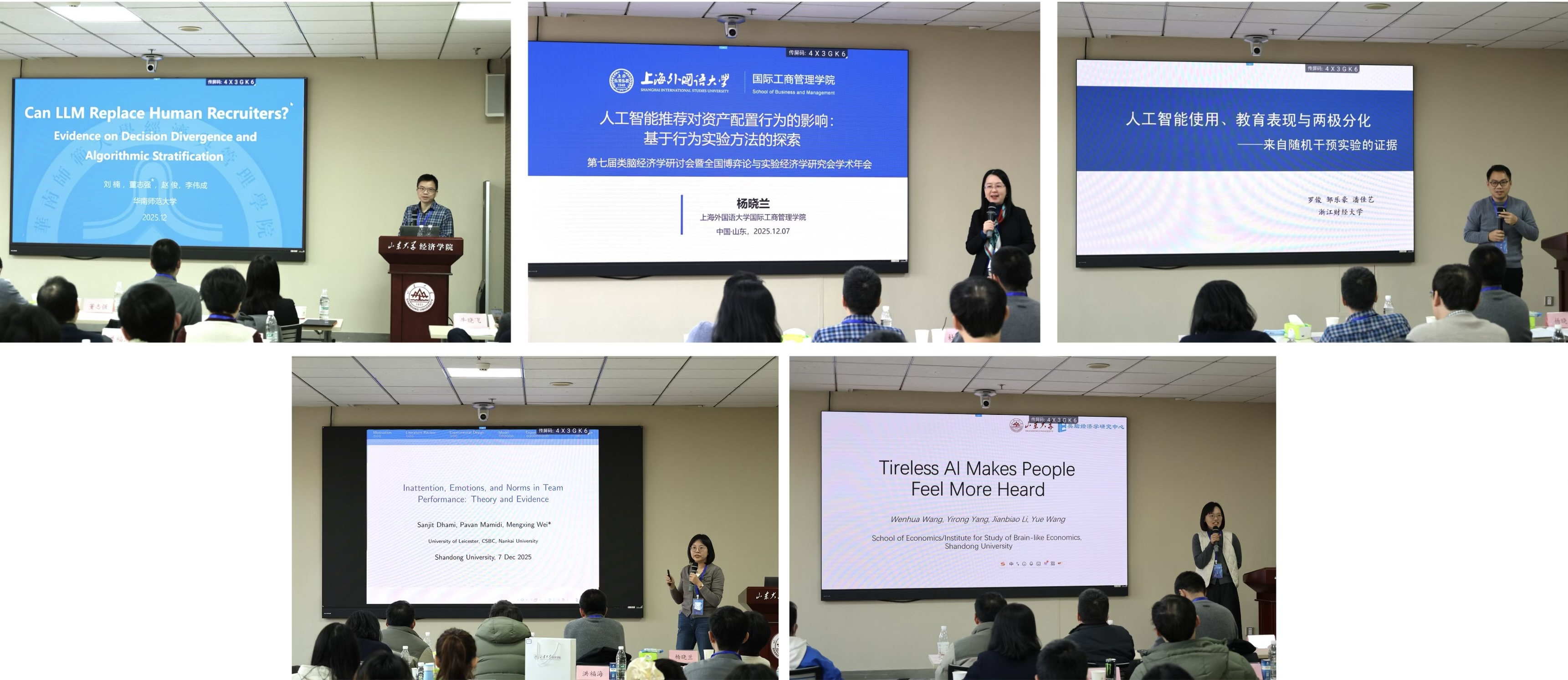 华南师范大学董志强教授作题为“CanLLM Replace Human Recruiters?Evidence onDecisionDivergence andAlgorithmicStratification”的报告,提出LLM尚不能替代HR,只能作为弱辅助筛选工具,因为AI并没有复制HR的判断逻辑,而是形成“结构性不同”的筛选规则。上海外国语大学杨晓兰教授作题为“人工智能推荐对资产配置行为的影响:基于行为实验方法的探索”的报告,阐述了AI推荐在不同呈现方式(数字vs.标签)下对个体层面资产配置行为及群体层面羊群效应的影响。浙江财经大学罗俊教授作题为“人工智能使用、教育表现与两极分化:来自随机干预实验的证据”的报告,系统评估了生成式人工智能对大学生教育表现的广泛影响。南开大学尉孟星副教授作题为“Inattention, Emotions, and Norms in Team Performance: Theory and Evidence”的报告,阐释了团队成员如何根据社会信号和私人信号调整其努力程度。英国365集团官网/英国365集团类脑经济学研究中心王文华博士作题为“Tireless AI Makes People Feel More Heard”的报告,揭示了人工智能能有效使人们感受到被倾听,这主要得益于其不会产生共情疲劳的特性。