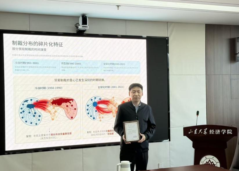 报告聚焦贸易制裁引发的地缘经济格局变动,以全球生产网络的深度关联为背景,创新性地构建附带关税楔子的全球生产网络模型,并引入“引力核心”地缘经济分析框架,系统探讨贸易制裁对经济碎片化的推动机制。在此基础上,报告进一步量化了碎片化情景下关税冲击对全球各国福利的影响,深入剖析福利变动背后的核心逻辑。实证研究结果显示,不同历史时期贸易制裁的作用焦点与效应存在显著差异。冷战时期,制裁主要集中于跨集群贸易,其对全球贸易的抑制效应最为突出;进入全球化时期,制裁重心转向与非集群国家相关的贸易,核心目标在于削弱这类国家在全球经济网络中的“连接器”功能。一般均衡分析表明,贸易制裁已导致约0.184%的全球福利损失,若处于“连接器”地位的非集群国家在地缘经济与政治压力下被整合入任一核心伙伴集群,全球福利损失将进一步扩大至0.400%-0.599%。研究同时指出,全球投入产出网络关联度、消费和生产替代弹性以及名义工资刚性是影响各国福利变动的关键因素。报告过程中,张天顶教授就模型构建逻辑、实证分析方法及福利影响机制等问题与参会师生展开深入研讨。