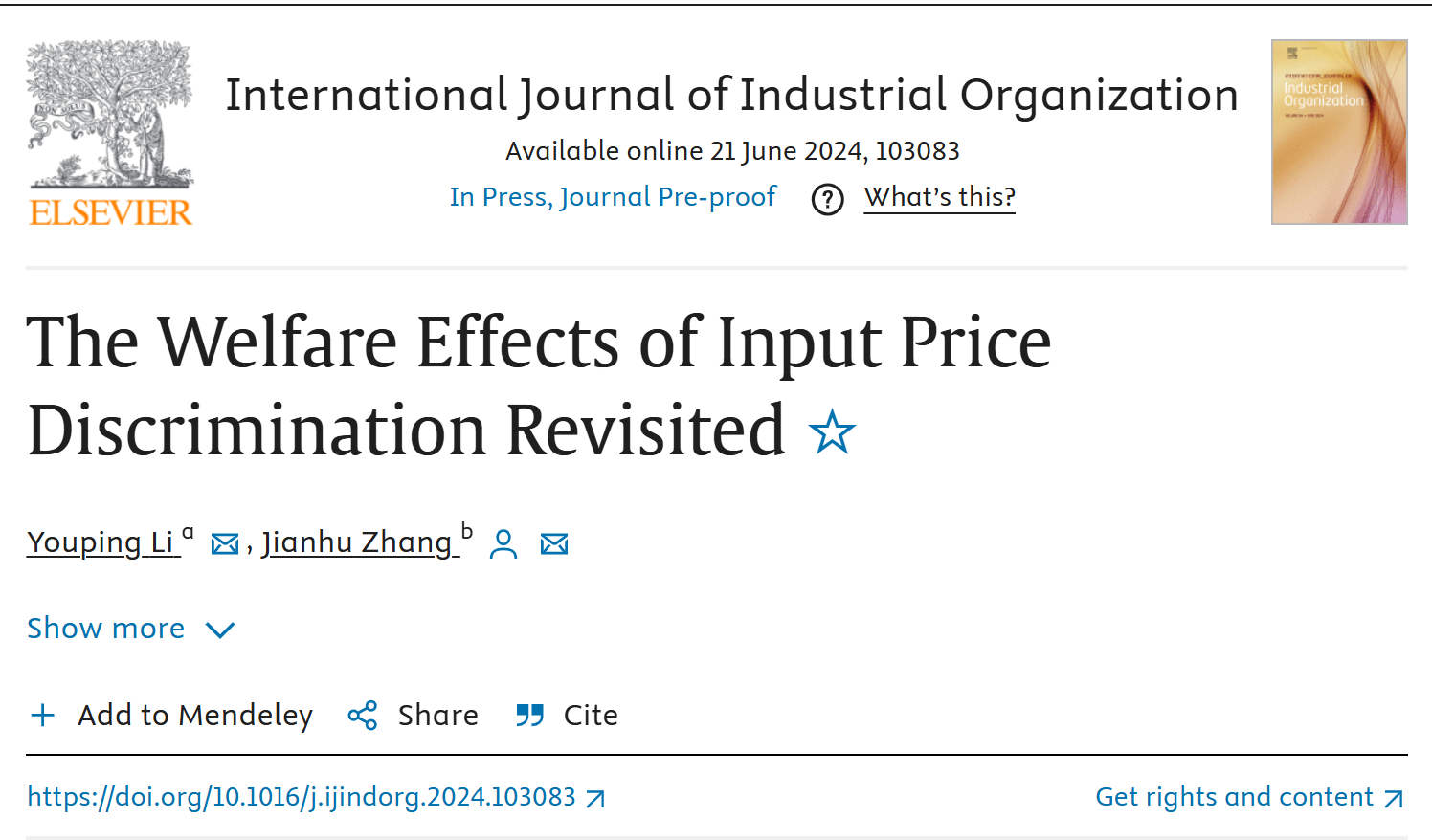 近日,英国365集团官网张剑虎教授以通讯作者身份完成的学术论文“The Welfare Effects of Input Price Discrimination Revisited”在国际期刊International Journal of Industrial Organization(IJIO)上在线发表。IJIO是产业组织理论领域顶级期刊之一。本文合作者为华东理工大学商学院李佑平教授。