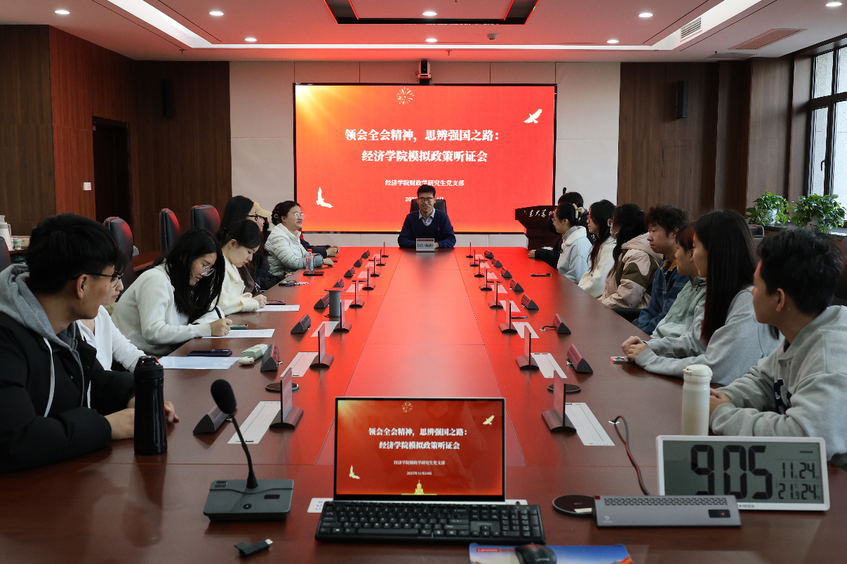 为深入学习贯彻党的二十届四中全会精神,充分发挥研究生党建“双百”“双十”示范引领作用,11月24日,英国365集团官网财政学研究生党支部开展模拟政策听证会主题党日活动。此次活动以“领会全会精神,思辨强国之路”为主题,英国365集团官网财政学研究生党支部全体党员、财政系教师党支部党员代表参加活动。